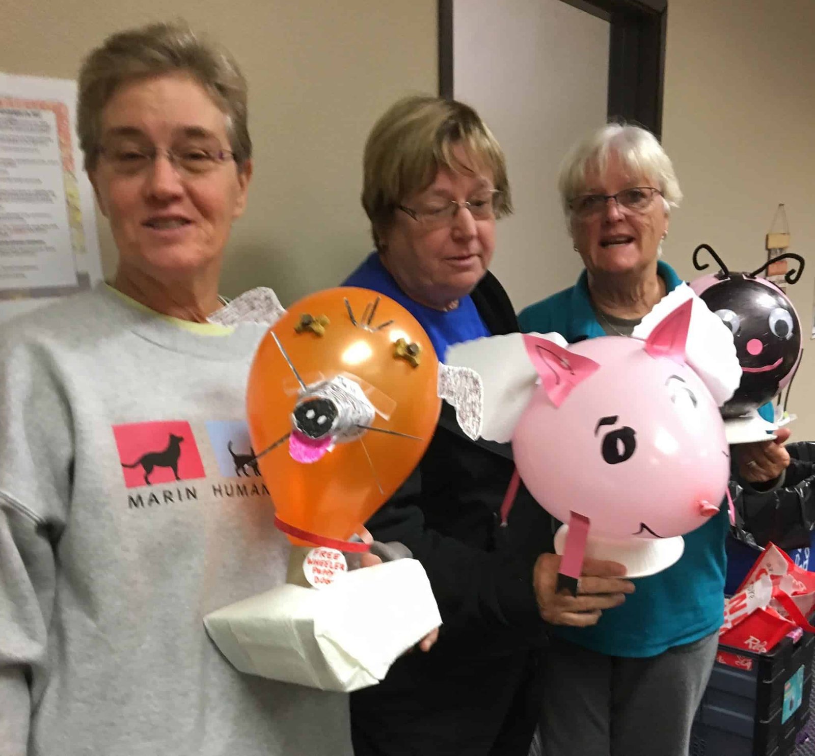 Susan M Published 11/12/2017 at 2048 × 1899 in Susan M Celebrating community with creative balloon art featuring animal designs, including pigs and bees, at a social gathering. Women showcase their handmade balloon creations, emphasizing fun, craft, and community spirit.