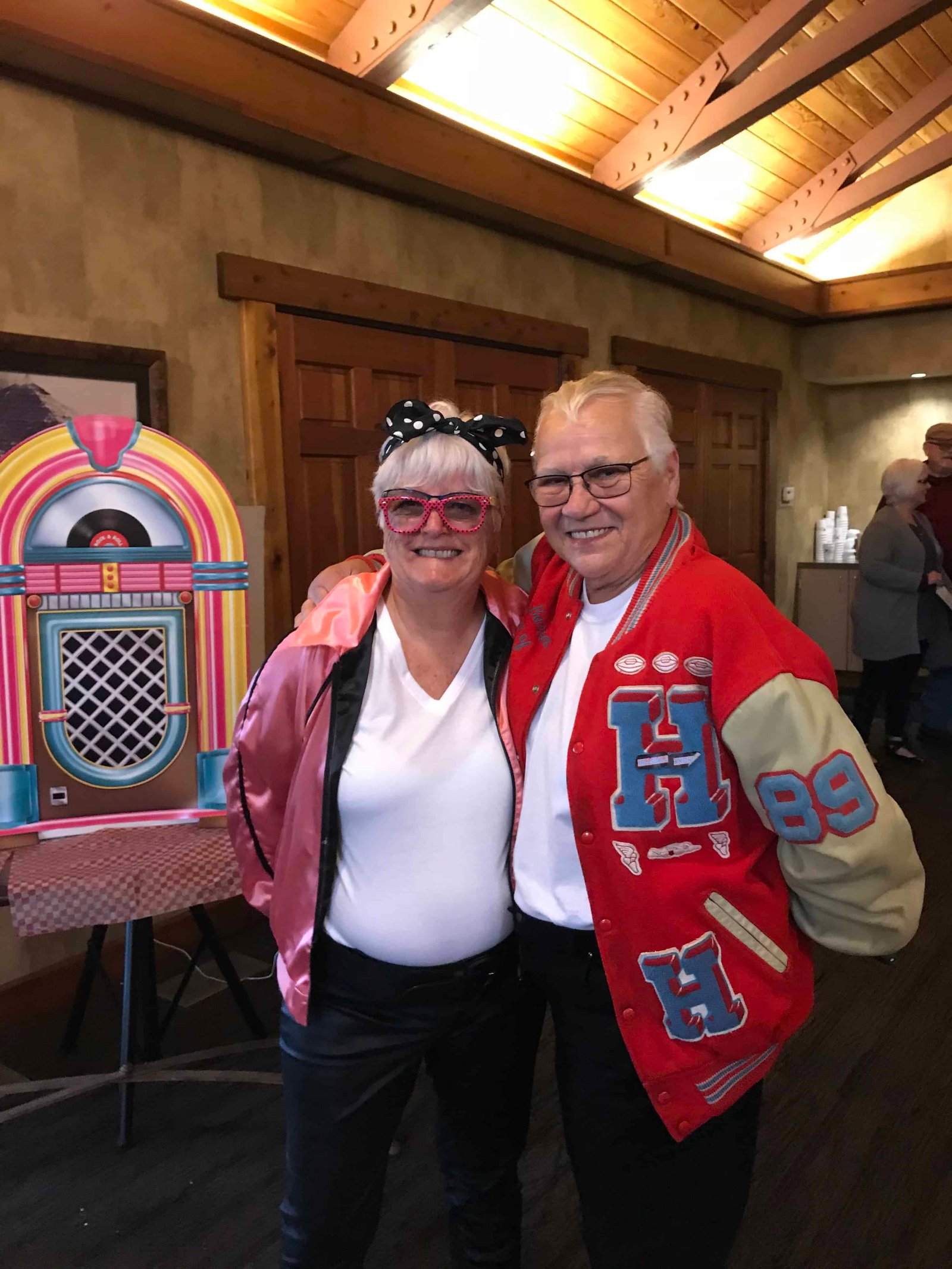 Jitterbug 2018 1 Published 04/11/2018 at 3024 × 4032 in Jitterbug 2018 1 A cheerful, vintage-inspired couple enjoying a nostalgic party atmosphere with retro clothing, glasses, and a jukebox, capturing the fun and lively spirit of the FreeWheelers event.