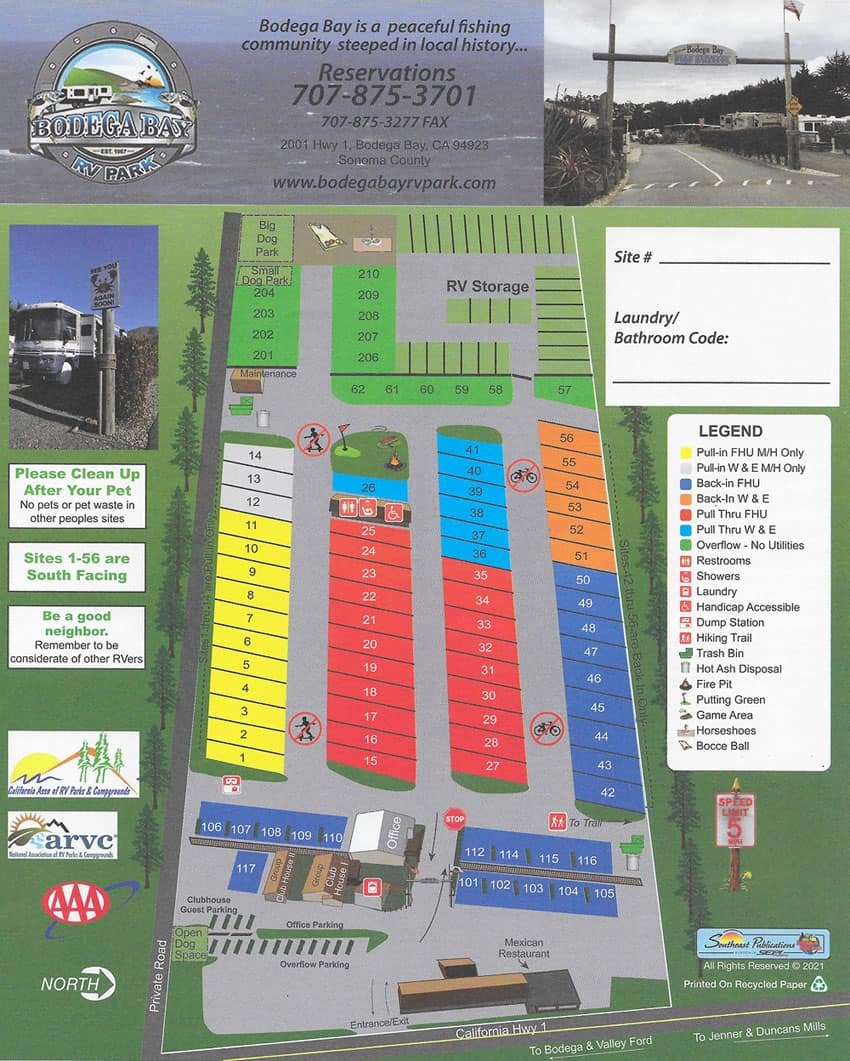 A detailed map of Bodega Bay RV Park highlighting campsite locations, amenities, and rules for RV camping in California. Features site numbers, pet area, RV storage, restrooms, and recreational zones, ensuring a comfortable and enjoyable outdoor experience for visitors and travelers in Sonoma County.