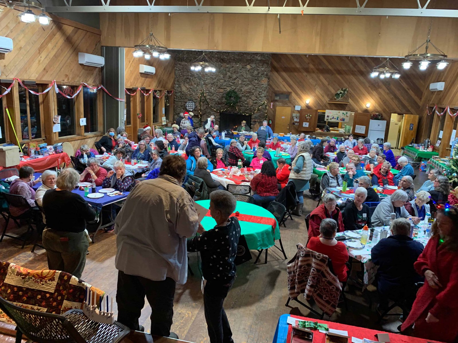 Christmas 2021 Published 03/28/2022 at 4032 × 3024 in Christmas 2021 Christmas 2021A large group of seniors enjoying a Christmas party indoors, seated at decorated tables with holiday decor, in a cozy wooden lodge with festive decorations, celebrating together with food and social activities.