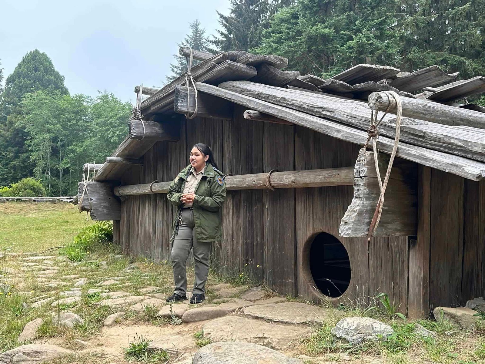 Elk country – Yurok Village Ranger – Suemeg Village 2023 Published 08/08/2023 at 2048 × 1536 in Elk country – Yurok Village Ranger – Suemeg Village 2023 A park ranger shares insights about wildlife conservation at a rustic wooden animal shelter in the forest.