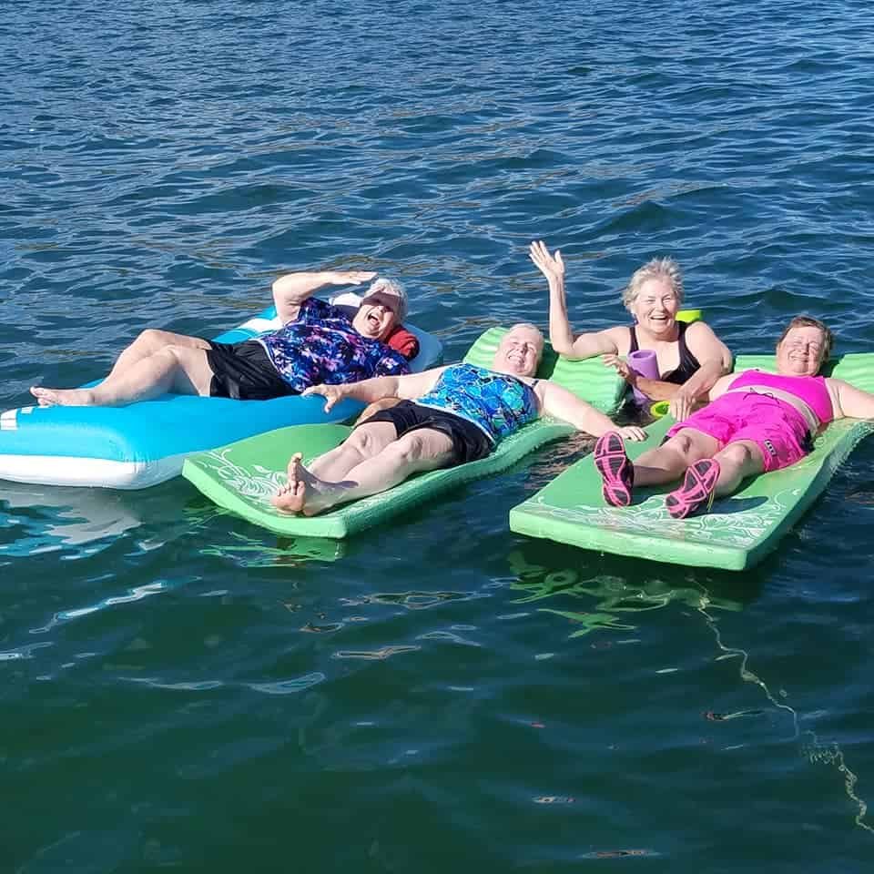 Four senior women lying on inflatable mattresses in the water, smiling, relaxing, and waving, enjoying a sunny day at the lake or pool during a summer outing. Women relaxing on floating pool loungers, engaging in water leisure and socializing, perfect for outdoor summer recreation.