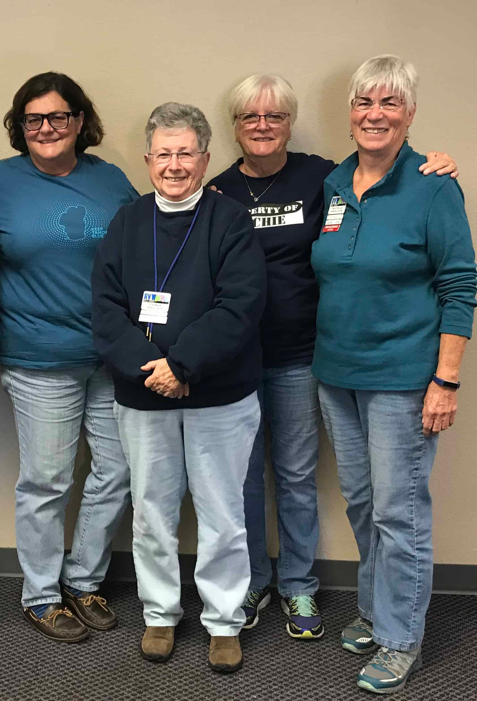 A group of women at a cycling event or women’s health conference, smiling and wearing themed clothing and badges, representing community support, empowerment, and advocacy for women’s health and active living.