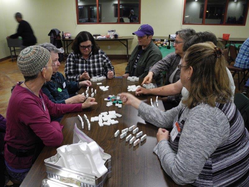 A group of diverse adults playing dominoes together around a table at a community gathering, enjoying social interaction and recreational activities; community engagement, senior activities, socialization, indoor game, group activity, fun, recreational event, inclusive gathering, social event, leisure activity.