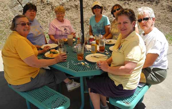 Jini, Beth and Susan Published 05/12/2015 at 600 × 380 in Jini, Beth and Susan Photo 093Six women and one man, all smiling and relaxed, sharing plates and drinks under a sunny sky at a park or outdoor food venue.