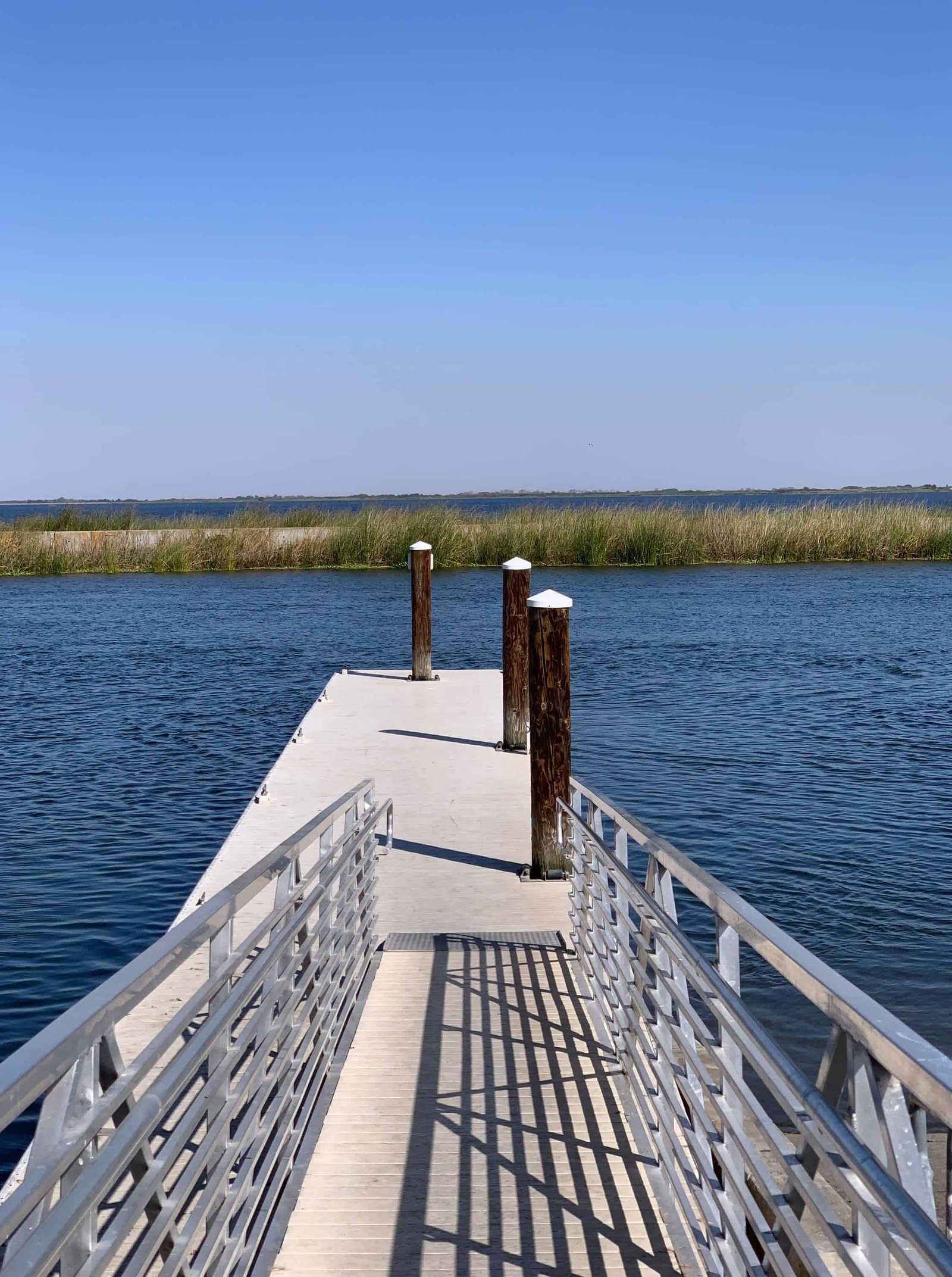 Sugar Barge Dock Published 03/20/2022 at 2256 × 3024 in Sugar Barge Dock A serene wooden dock over a calm body of water, with grassy marshlands and a clear blue sky, perfect for boating, fishing, and outdoor adventures.