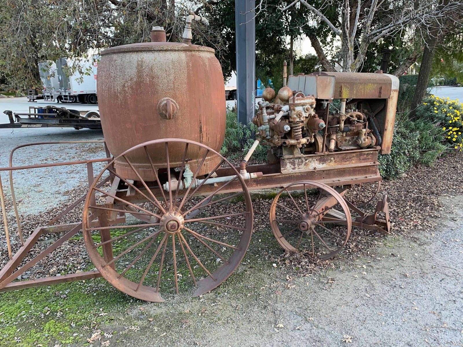 Casa de Fruta Antiques Published 03/20/2022 at 3024 × 2268 in Casa de Fruta Antiques Rusty vintage tractor with water tank and mechanical engine, outdoor setting with trees, highlighting historic farming equipment and machinery.