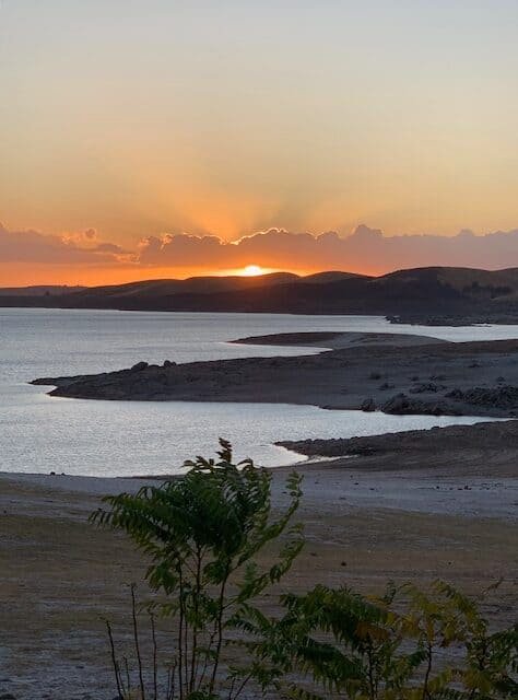 A peaceful lakeside scene at sunset showcasing calm waters, a sandy shore, and lush greenery, perfect for outdoor recreation, nature photography, and leisure activities.