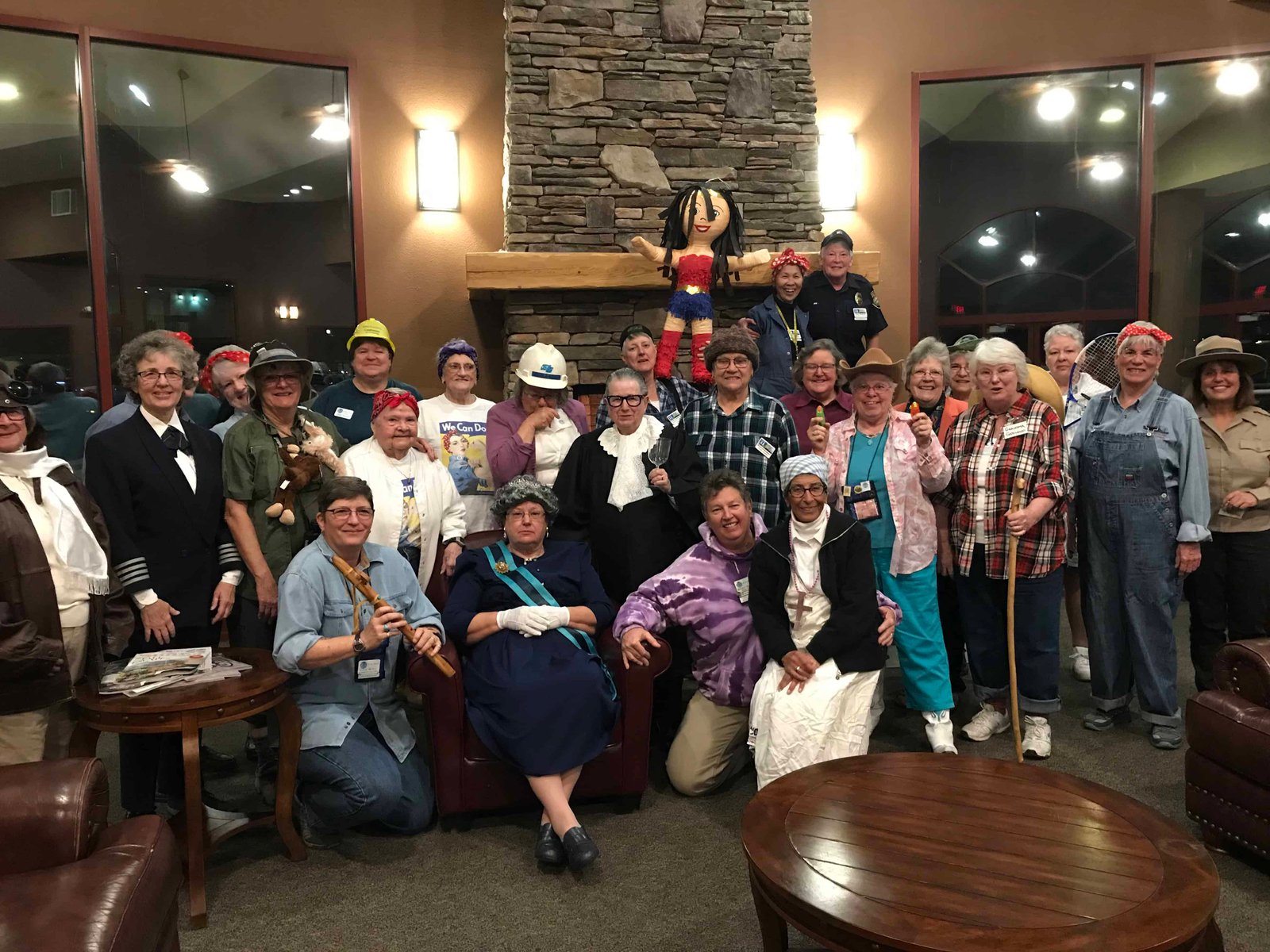 Admired Women – Red Bluff 2018 Published 03/26/2018 at 4032 × 3024 in Admired Women – Red Bluff 2018 A diverse group of senior women dressed in colorful costumes, gathered in a cozy indoor setting with a stone fireplace, celebrating a themed event with costumes, props, and cheerful interactions, emphasizing community engagement and fun for seniors.
