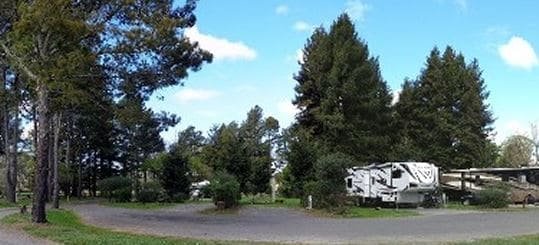 Olema2 Published 03/20/2022 at 539 × 245 in Olema2 A large outdoor RV storage facility featuring several parked camper trailers among tall pine trees, providing ample space for outdoor recreational vehicle parking and storage.