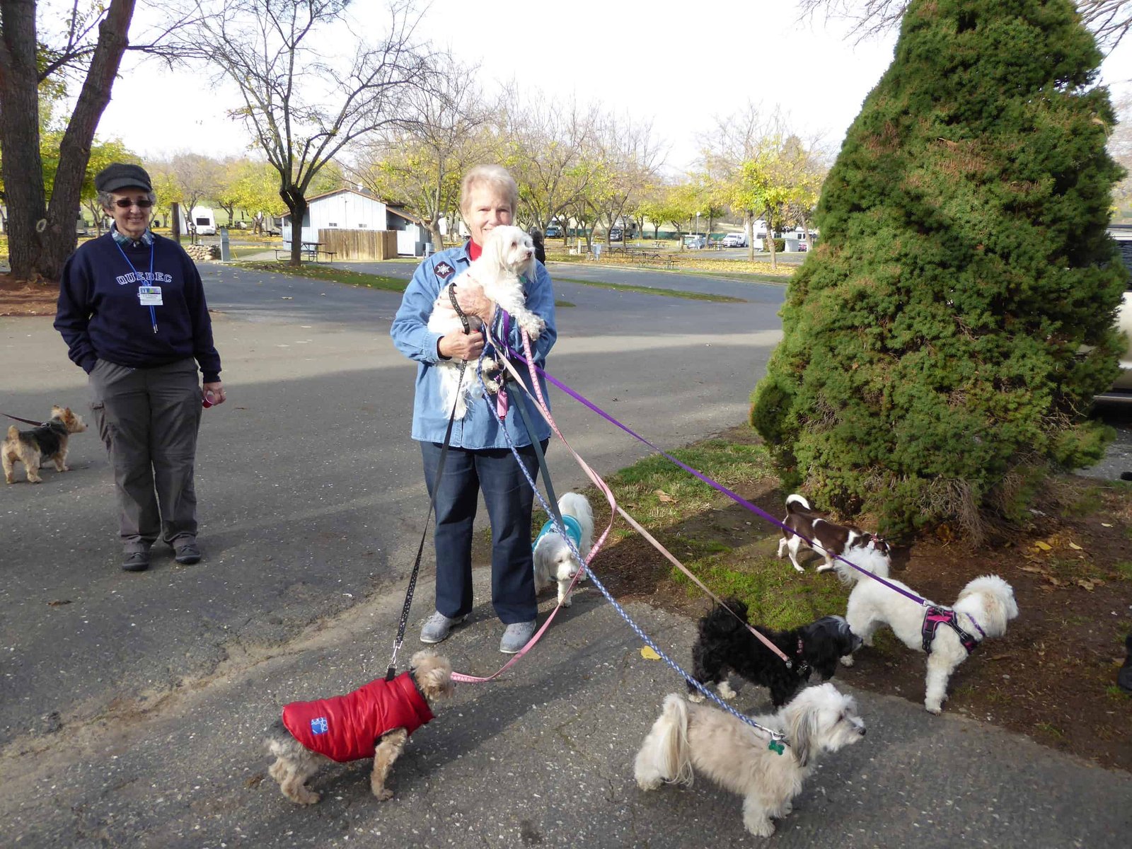 LT and Marsha N 2018 Published 01/12/2018 at 2560 × 1920 in LT and Marsha N 2018 Participating in a dog-friendly outdoor event, a woman holds several small dogs on leashes, while another person and their dogs observe, in a scenic park with trees and open space.