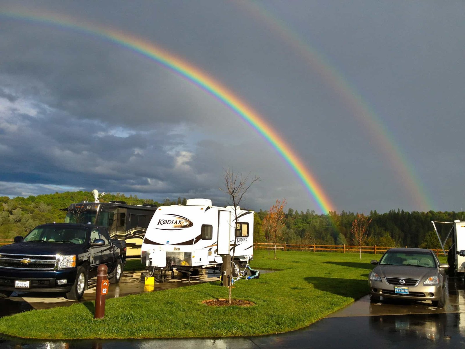 Rainbow-Jackson-3-13 Published 12/17/2013 at 2040 × 1530 in Rainbow-Jackson-3-13 A rare treat!Colorful rainbow arches across gray sky above parked RVs and cars in a scenic outdoor setting.