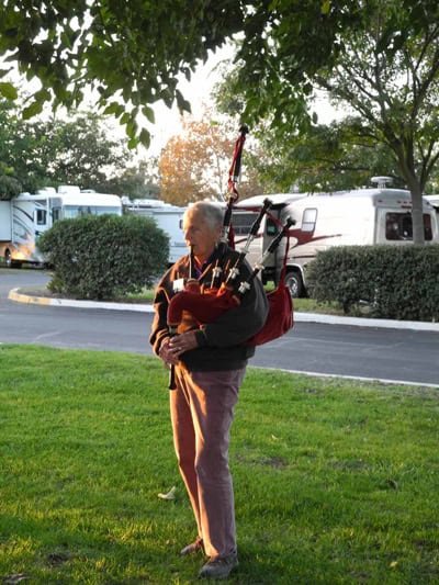 A senior man plays the bagpipes outdoors in a park-like setting with RVs in the background, highlighting a vibrant community event. The scene captures outdoor entertainment and recreational activities for seniors, emphasizing musical performance, community engagement, and the outdoor lifestyle of free-wheelers enjoying their leisure time.