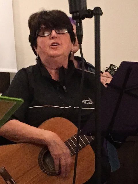 Una Published 10/03/2017 at 480 × 640 in Una A woman with short dark hair and glasses strums an acoustic guitar while singing into a microphone at a FreeWheelers event, highlighting community engagement and live music.
